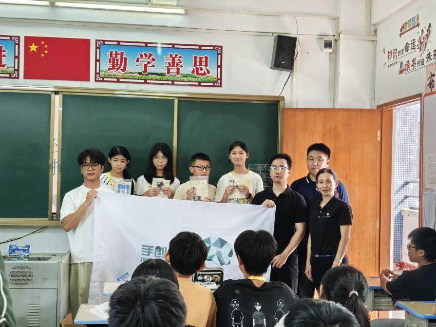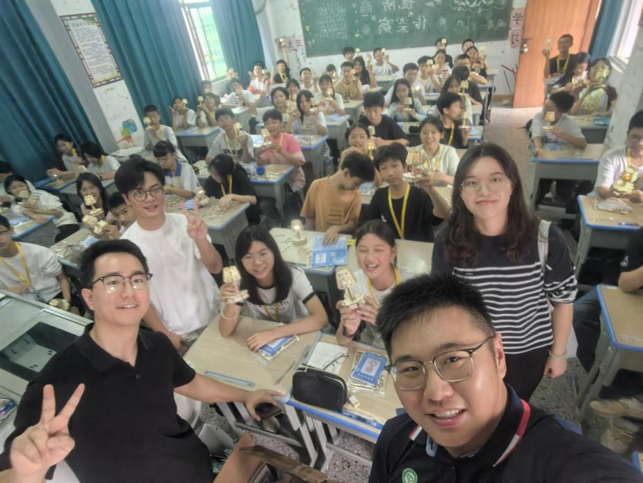 随后,宋美娴书记带领教师党员付中鑫、张星星与校友一起到垾塘下寨中学进行科创教育并送教具活动,实现跨越城市界限,传递科学火种,科普和科技走进校园。课堂上为同学们带来《声实音验室——声电控路原理》科普课堂,并指导学生亲手制作声控小台灯,这不仅是小制作,更是“百千万工程”送进乡村科学的大礼包!用科技点亮乡村课堂,用实践点燃科学梦想!