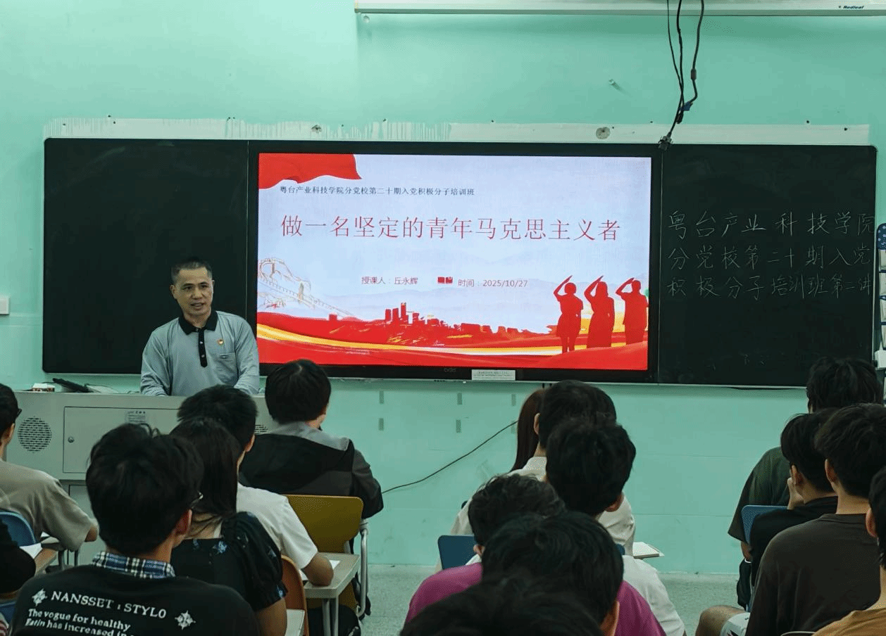 为提高入党积极分子的思想觉悟,鼓励同学们积极筑牢理想信念根基,引导青年学子明确时代使命与责任担当。10月28日,粤台学院在莞城校区实验楼315教室举行第二十期入党积极分子培训班第二讲。本次党课围绕“做一名坚定的青年马克思主义者”为题,由学院党委副书记丘永辉主讲。